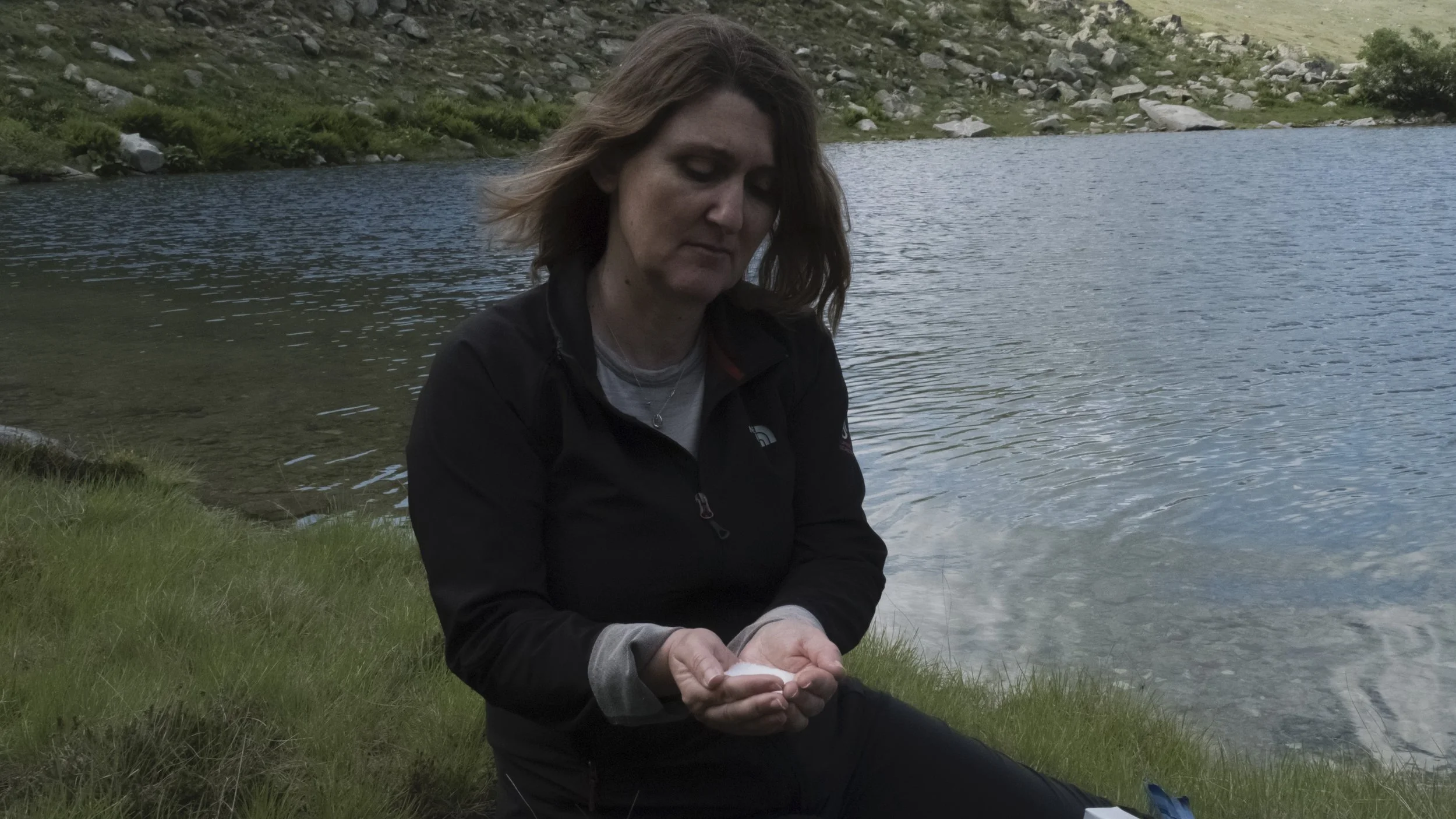 Mixing salt, Photograph. Land Print Project III, "Salt", 2018. This site-specific performance continues Čapovska’s ongoing investigation into the location of identity and ecological integrity of the Small Lake, Pelister National Park, Macedonia (elevation 2,180m). Photography: Istok Chapovski