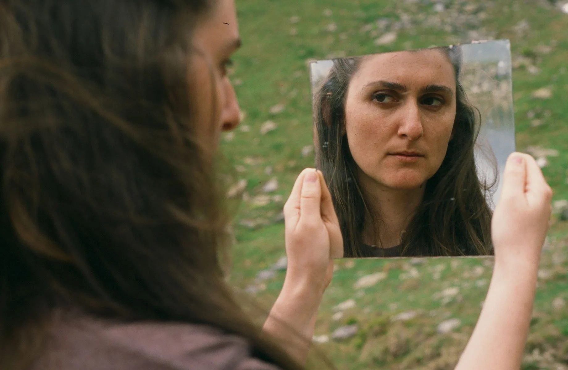 Mirror, 1994. Photograph. Land-Print Project I, Small Lake, Pelister National Park (el. 2180m.) Macedonia. Site-specific performance including a mirror, 4 glass ball object, 3 circular zinc plates and a bottle with blue pigment. "The first phase, observing her image in the mirror, in which she simultaneously peers out at the reflection of the lake, is necessary to identify the limits of her own body. Like in the “mirror stage”, well known from the psychoanalytical discourse (Lacan, Kristeva) in which the subject identifies oneself only through the fragmentation of “self’ and “other”, (the own reflection in the mirror), Capovska locates her own identity out of the boundaries of her own body-in her reflection but, at the same time, in the reflection of the lake on the same surface of the mirror” (Milevska 1994). Object: mirror. Photography and video camera: Robert Jankuloski. Guides to the lake: Zlatko Sterjov and Simeon Girovski Sponsor: Soros Centre for Contemporary Arts- Skopje, Macedonia