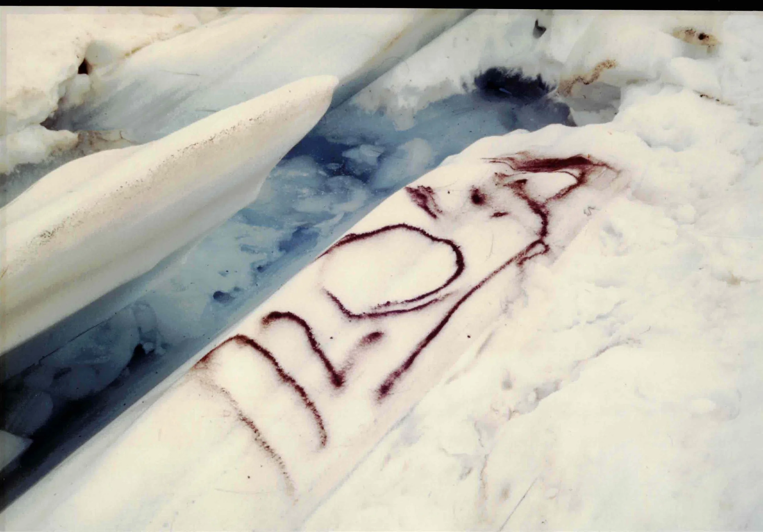 Bottle with blue pigment, Photograph. Land Print Project 1, 1994. Small Lake, Pelister National Park, el. 2180m. Macedonia. Site-specific performance. Photography and video camera: Robert Jankuloski. The first project. Land Print Project (1994) is concerned with the theme of location of identity and the ecological integrity of the lake. It draws on the cultural theory of identity, self and nature.